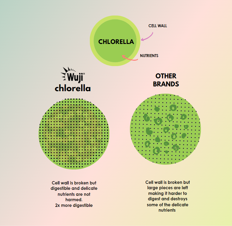 This process makes Wuji Chlorella 2x more digestible than other company processes.